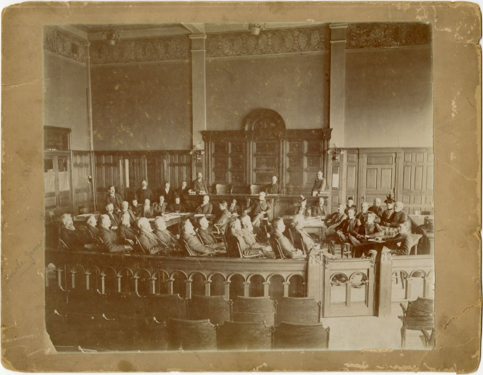 Benjamin Harrison (left of center in the middle of the room) at the Richmond, Wayne Co., Indiana, court room during the Morrison will trial in 1895.