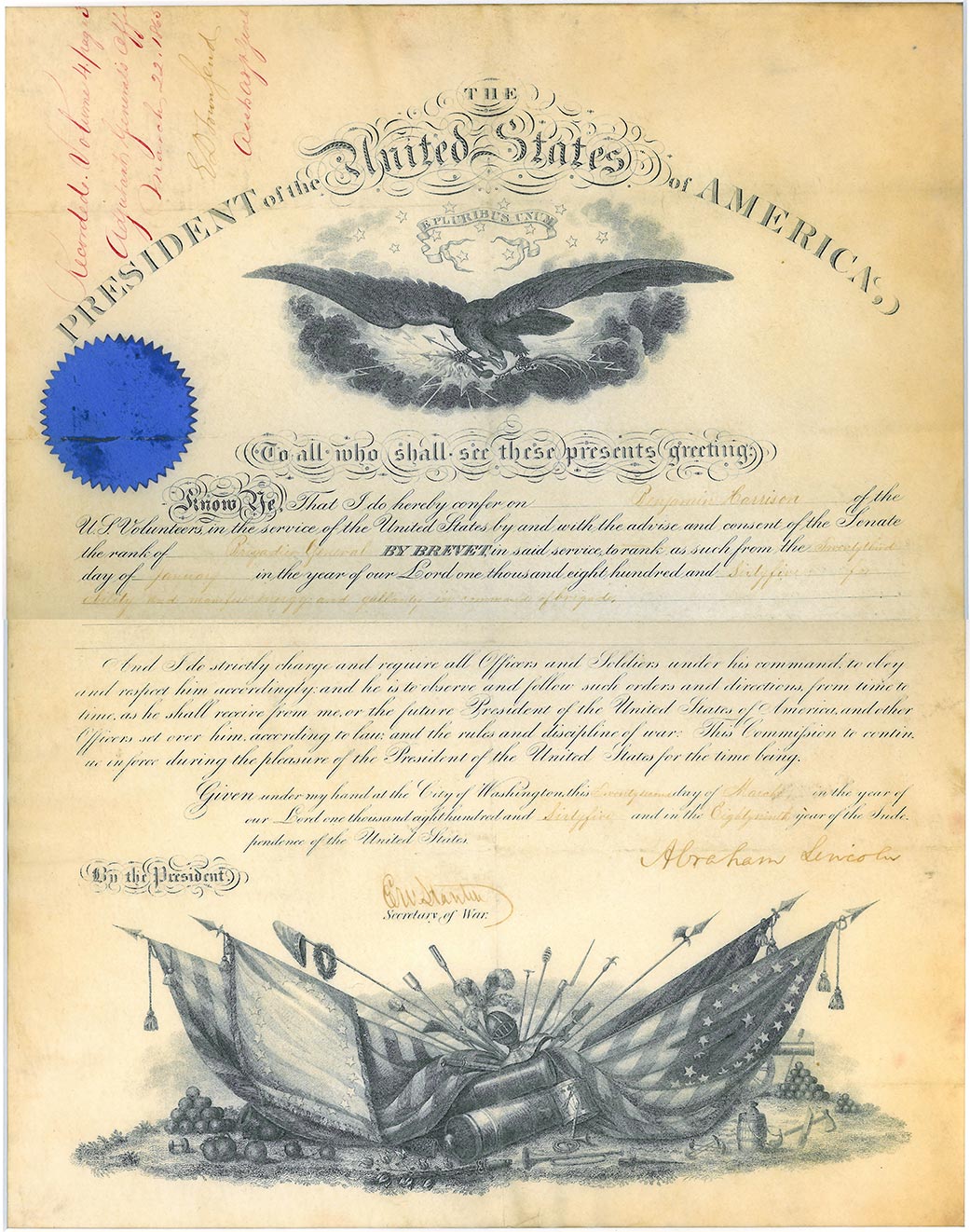 In May 1864, Colonel Harrison and the regiment joined General Sherman’s Atlanta campaign in the Army of the Cumberland. For Harrison’s achievements at the battles of Resaca and Peachtree Creek, he was promoted to Brigadier General.