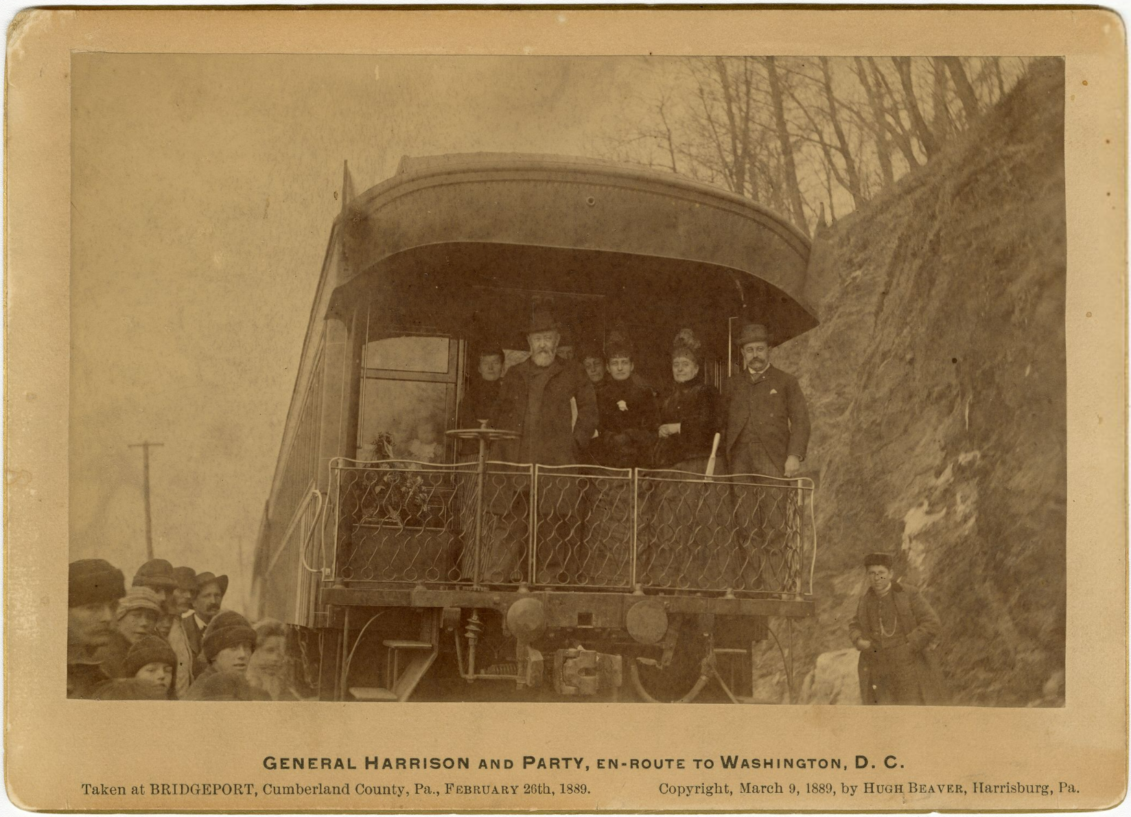 Benjamin Harrison and party on back of train en route to Washington, D. C., in February 1889.