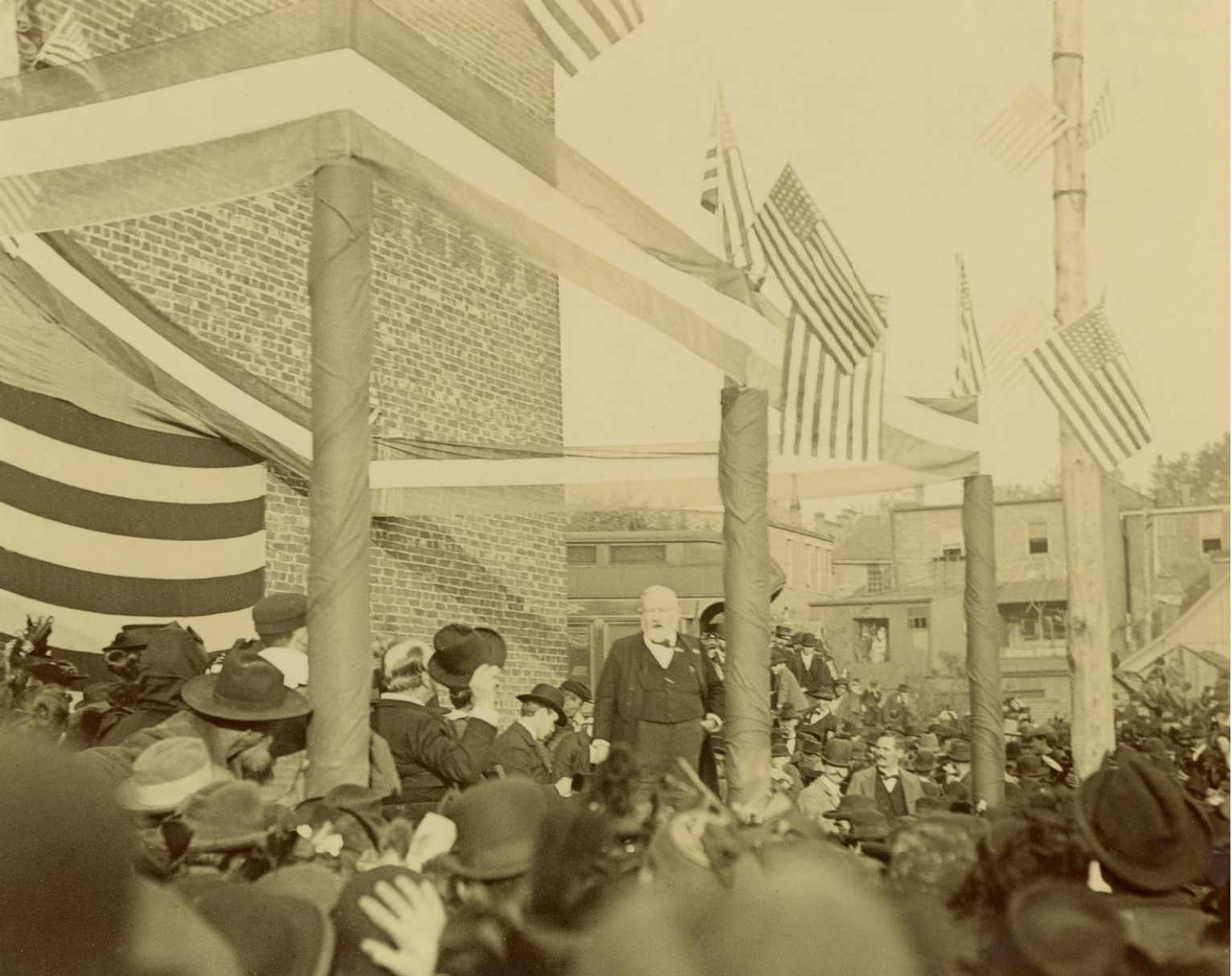 Benjamin Harrison speaking at the north end of the LNA & CRR train depot located in the area between W. Kirkwood Ave. and W. Fourth St. in Bloomington, Indiana, in 1896.