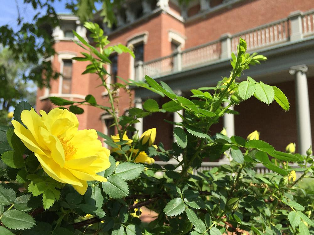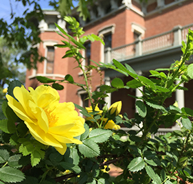 The Elizabeth Harrison Rose Garden located on the north side of the home offers brick pathways to walk through the period rose collection.